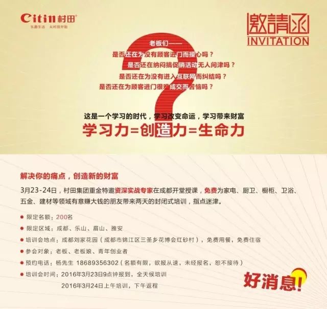 亲,福利来了,绝对爆棚!成都,3月23-24日,由平博在线平台(平博在线平台)集团主办,特邀移动互联网大咖及20余年资深终端销售实战专家王谦老师带来2天1夜“互联网+赢在终端”培训,即学即用,限定名额:200名,免学费/免吃住/抽大奖,错过一次,后悔一年。预约:杨先生 18689356302。