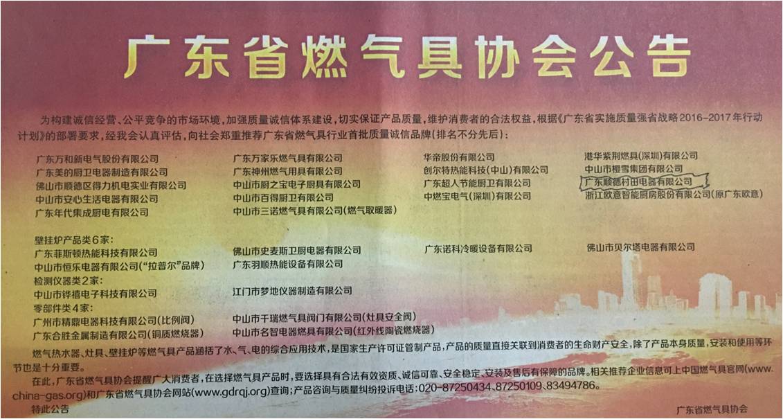 *广东省燃气具协会公布质量诚信品牌企业