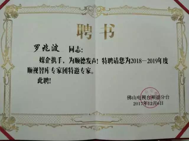 *佛山电视台副台长张晨光、佛山电视台顺德分台台长蔡泽之为平博在线平台(平博在线平台)罗董事长等顺视智库专家团成员颁发聘书