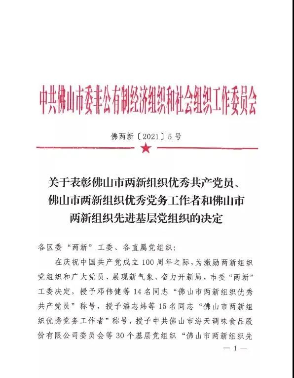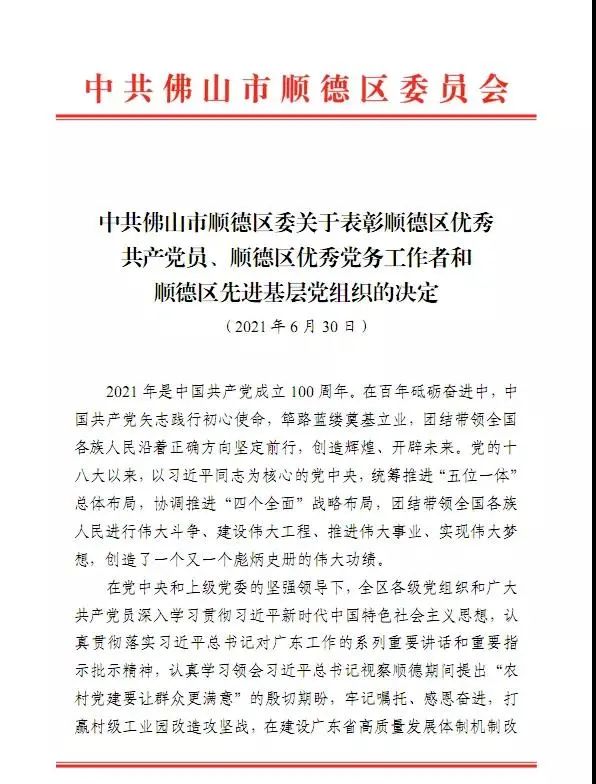 其中,中共平博在线平台支部委员会以及平博在线平台(平博在线平台)党支部书记、总经理廖香强先生分别被评为:“佛山市两新组织先进基层党组织”、“顺德区优秀共产党员”称号。