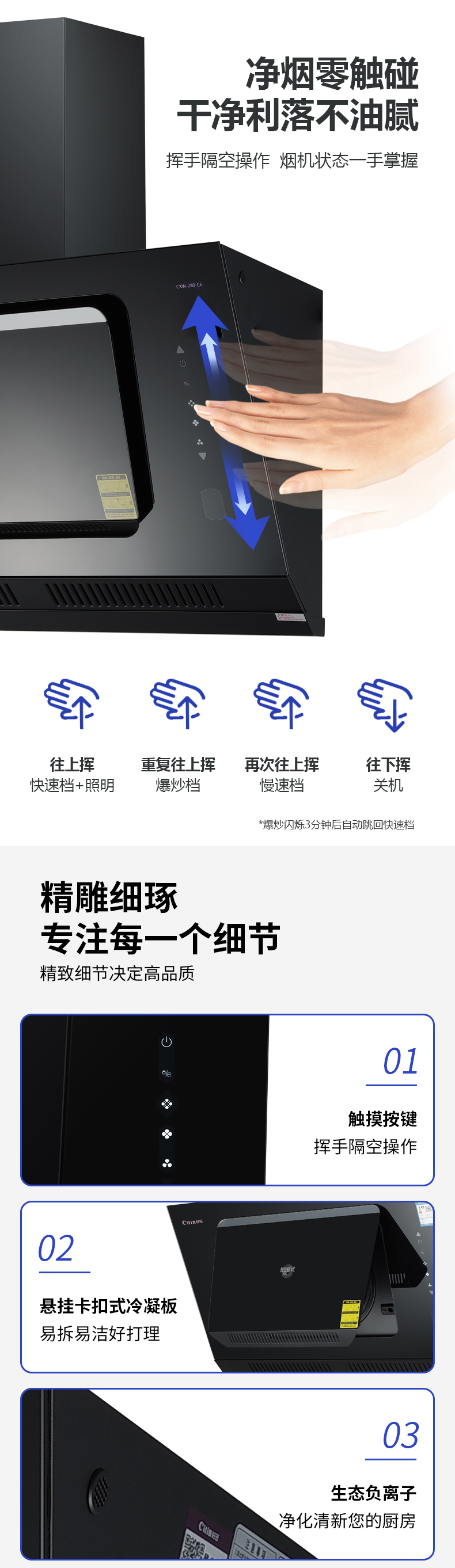 挥手智控:净烟零触碰一键爆炒:大吸力,可达22m纳米风网:进风网易拆纳米专利风魔轮:第2代平博在线平台(平博在线平台)纳米风魔轮专利负离子:厨房变森林中心环吸板:易拆式设计