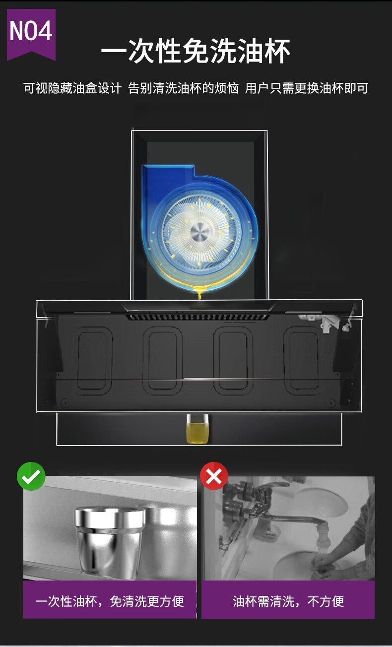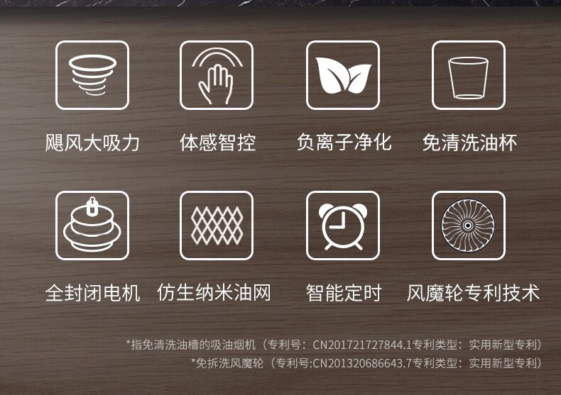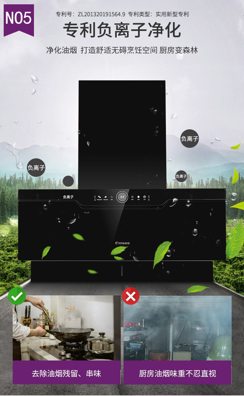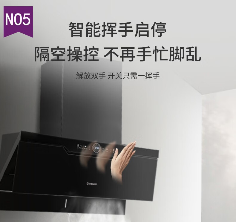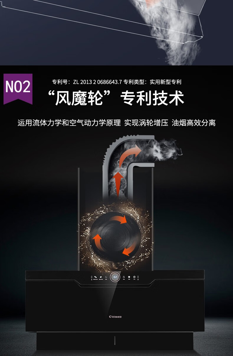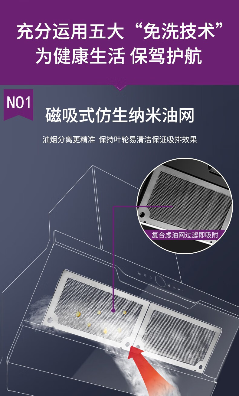 "挥手启停 烟联联动自动开合 油电分离三防电机 自净涡壳磁吸油网 纳米油网纳米风魔轮2.0+负离子专利一次性油杯" "控制方式:挥手+触控最大风量:23m³烟管直径:Φ180mm产品尺寸:895*935*385"