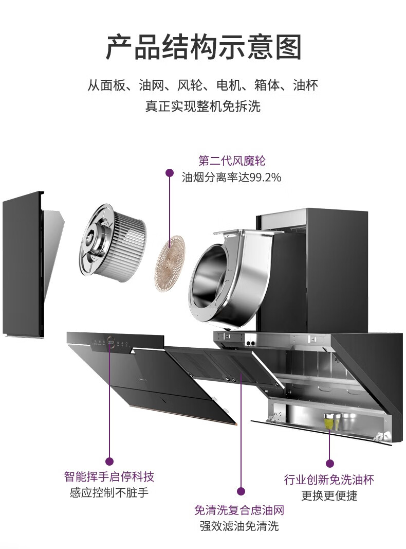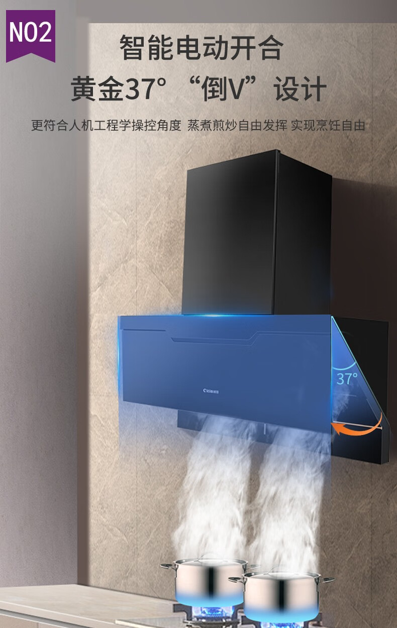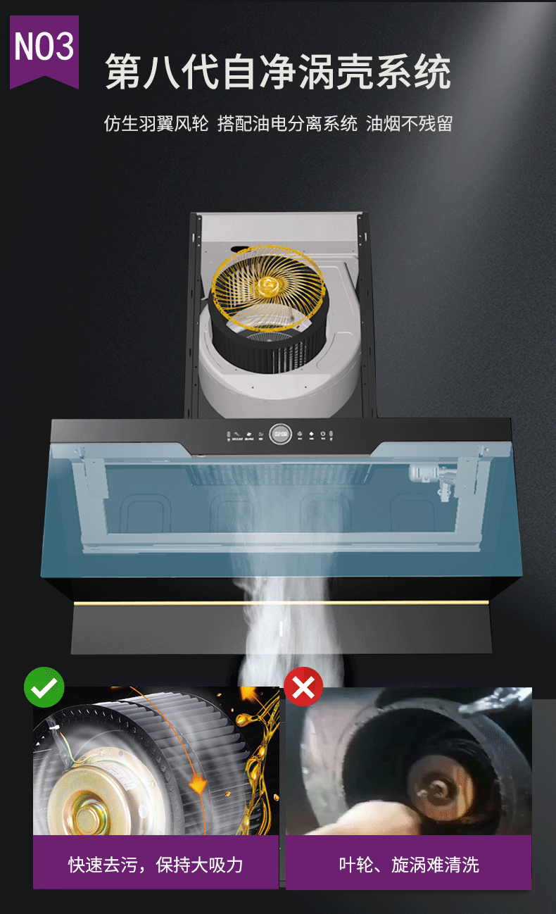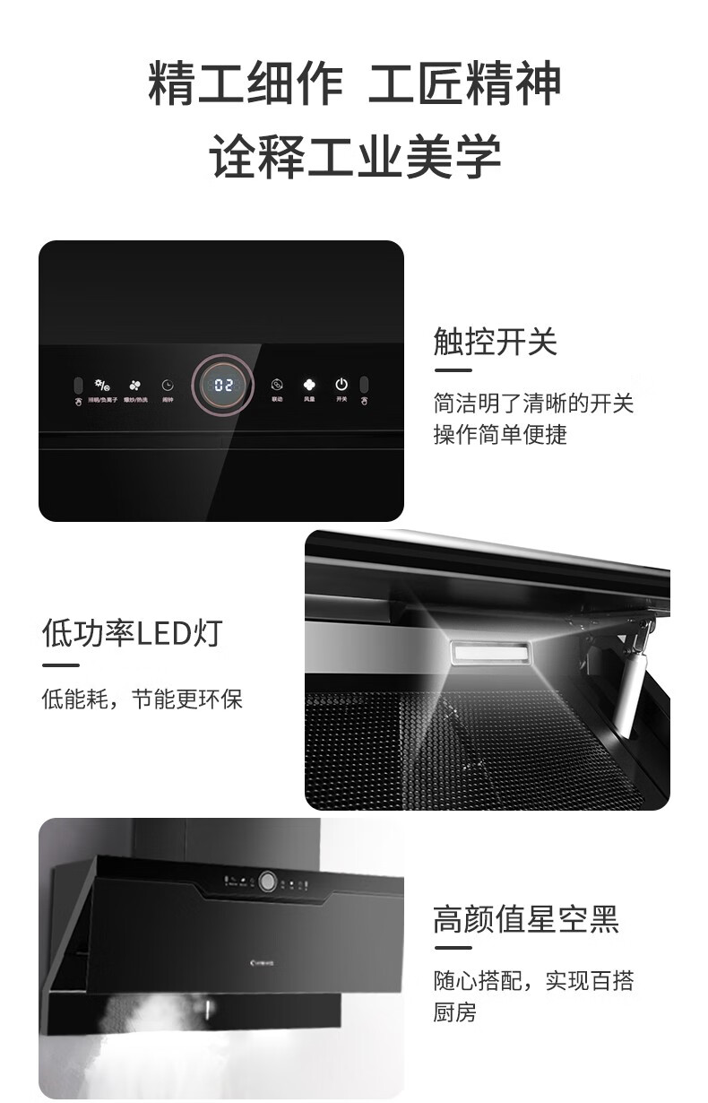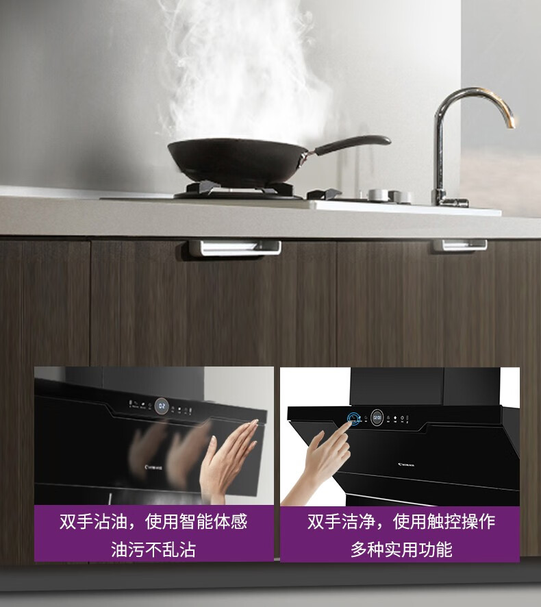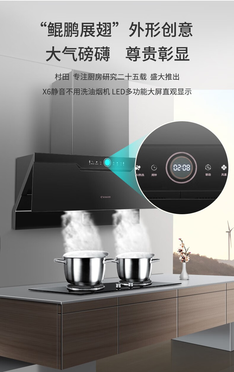 "挥手启停 烟联联动自动开合 油电分离三防电机 自净涡壳磁吸油网 纳米油网纳米风魔轮2.0+负离子专利一次性油杯" "控制方式:挥手+触控最大风量:23m³烟管直径:Φ180mm产品尺寸:895*935*385"