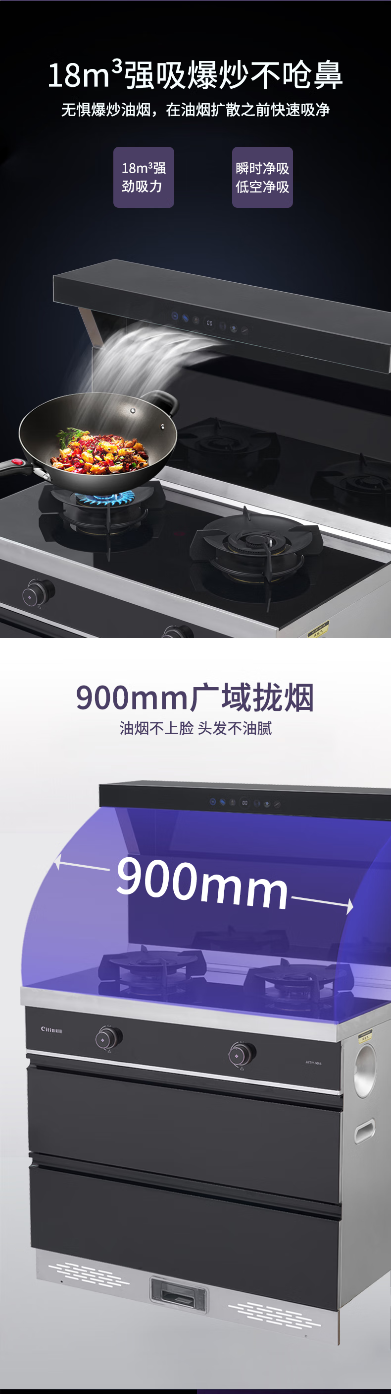 "负离子净化空气彩屏+挥手启停烟灶联动+暧菜宝防火墙+热除油防烫红点功能聚能锅支架" "能效等级:1级最大风量:19m³/min最大风压:570Pa 热负荷:T=5.0kW Y=4.5kW保洁柜容积:110L产品尺寸:900*600*1300"